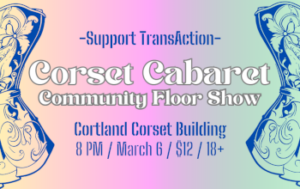 Join us on March 6 for Corset Cabaret, an 18+ variety show at the historic Cortland Corset Building. The evening will start at 8pm and includes Drag, burlesque, dance, jokes, song and all forms of creative expression. Learn More and Get TicketsĀ See you there!